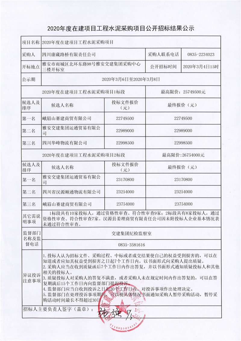 四川康藏路橋有限責(zé)任公司2020年度在建項(xiàng)目工程水泥采購(gòu)項(xiàng)目公開招標(biāo)結(jié)果公示