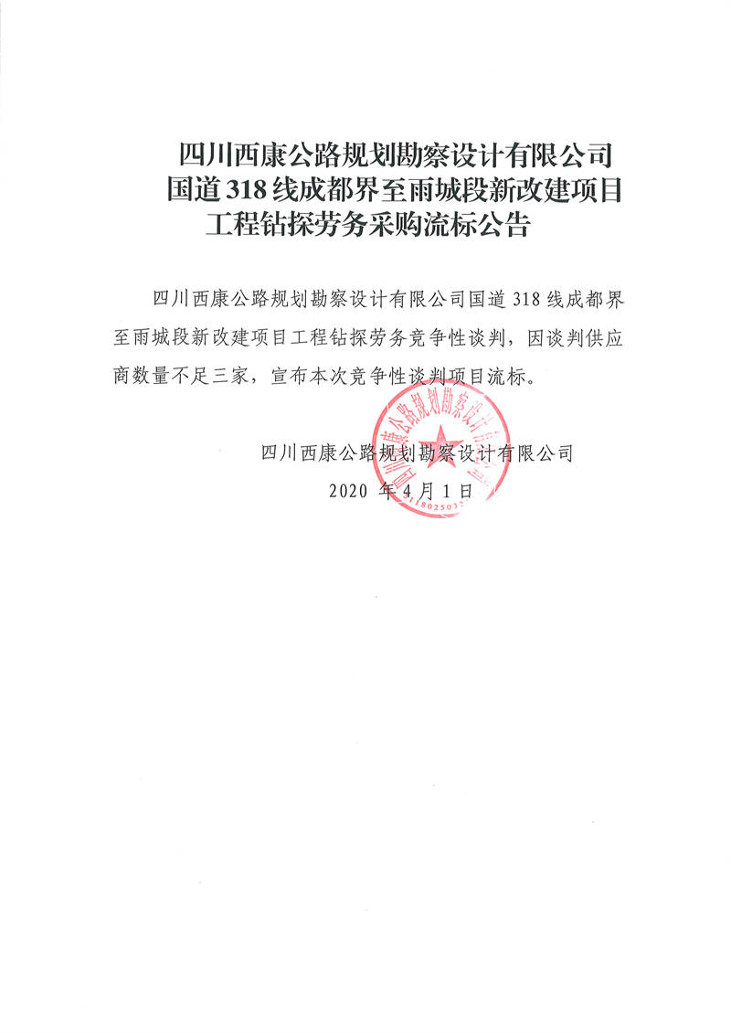 四川西康公路規(guī)劃勘察設計有限公司國道318線成都界至雨城段新改建項目工程鉆探勞務采購流標公告