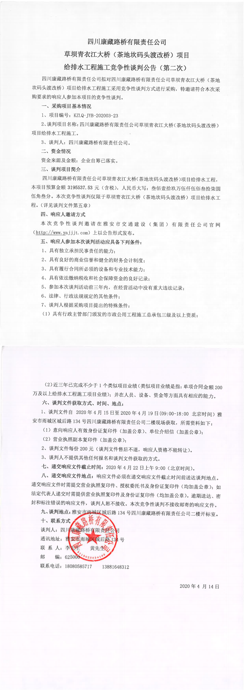 四川康藏路橋有限責任公司草壩青衣江大橋(茶地坎碼頭渡改橋)項目給排水工程施工競爭性談判公告(第二次)