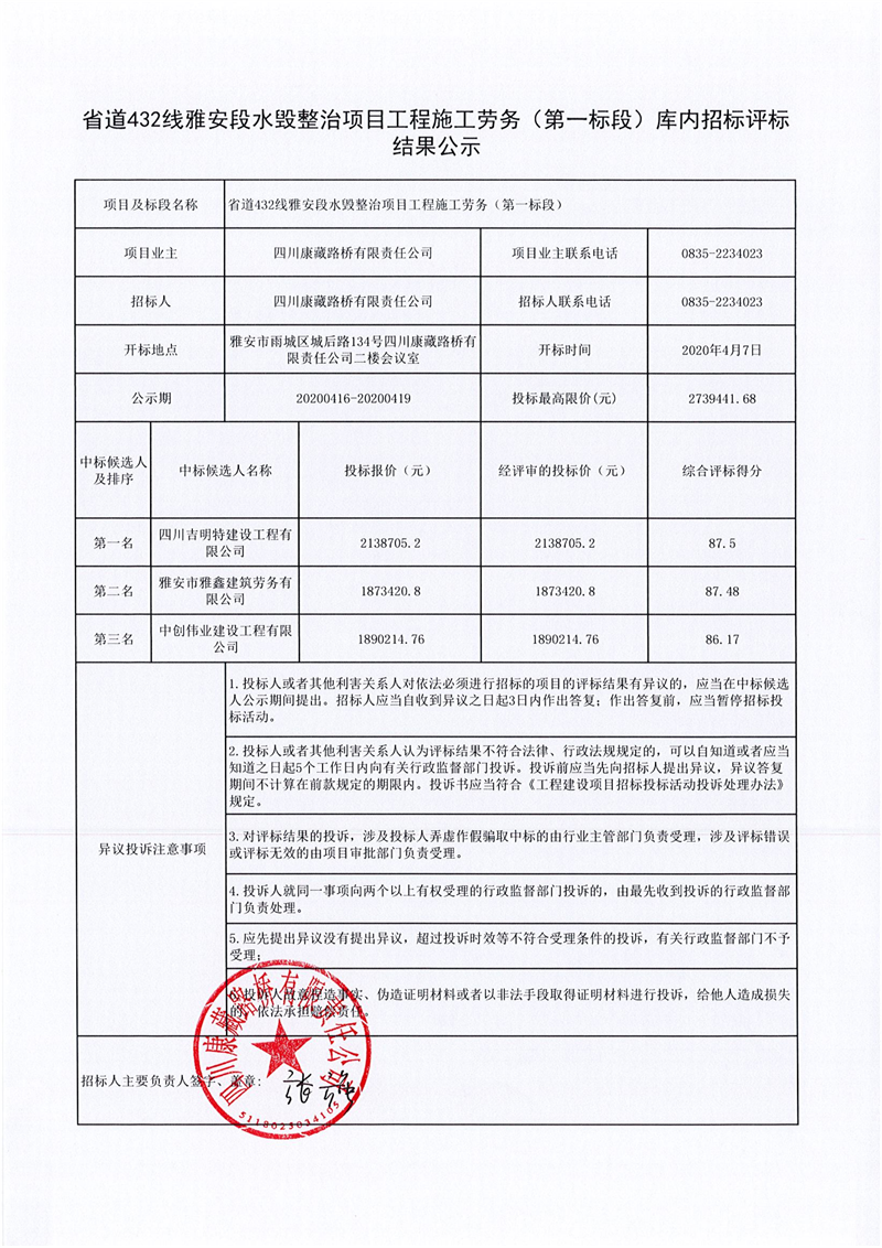 四川康藏路橋有限責任公司省道432線雅安段水毀整治項目工程施工勞務(第一標段)庫內(nèi)招標評標結果公示