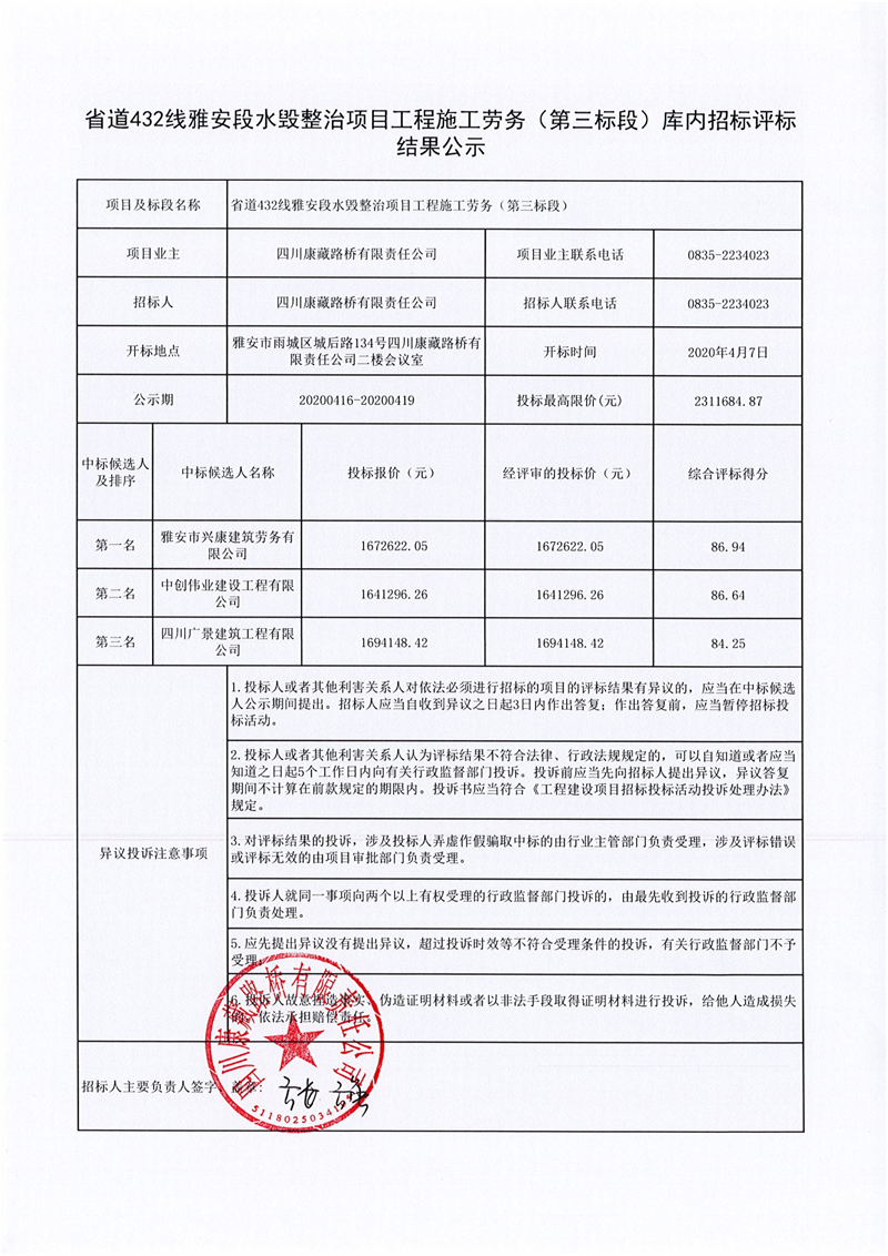 四川康藏路橋有限責(zé)任公司省道432線雅安段水毀整治項(xiàng)目工程施工勞務(wù)(第三標(biāo)段)庫內(nèi)招標(biāo)評(píng)標(biāo)結(jié)果公示