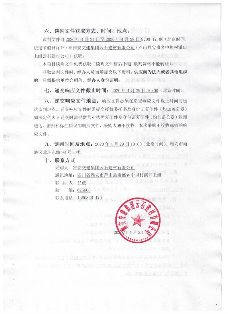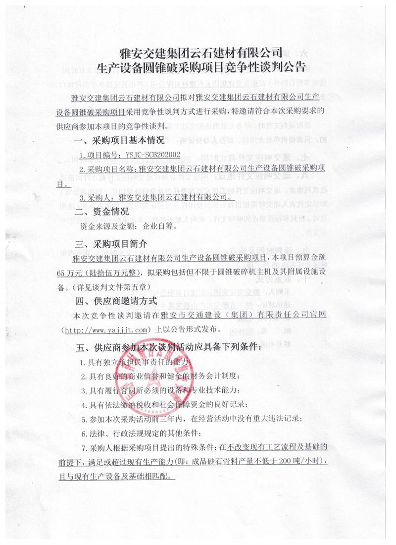 雅安交建集團云石建材有限公司生產設備圓錐破采購項目競爭性談判公告