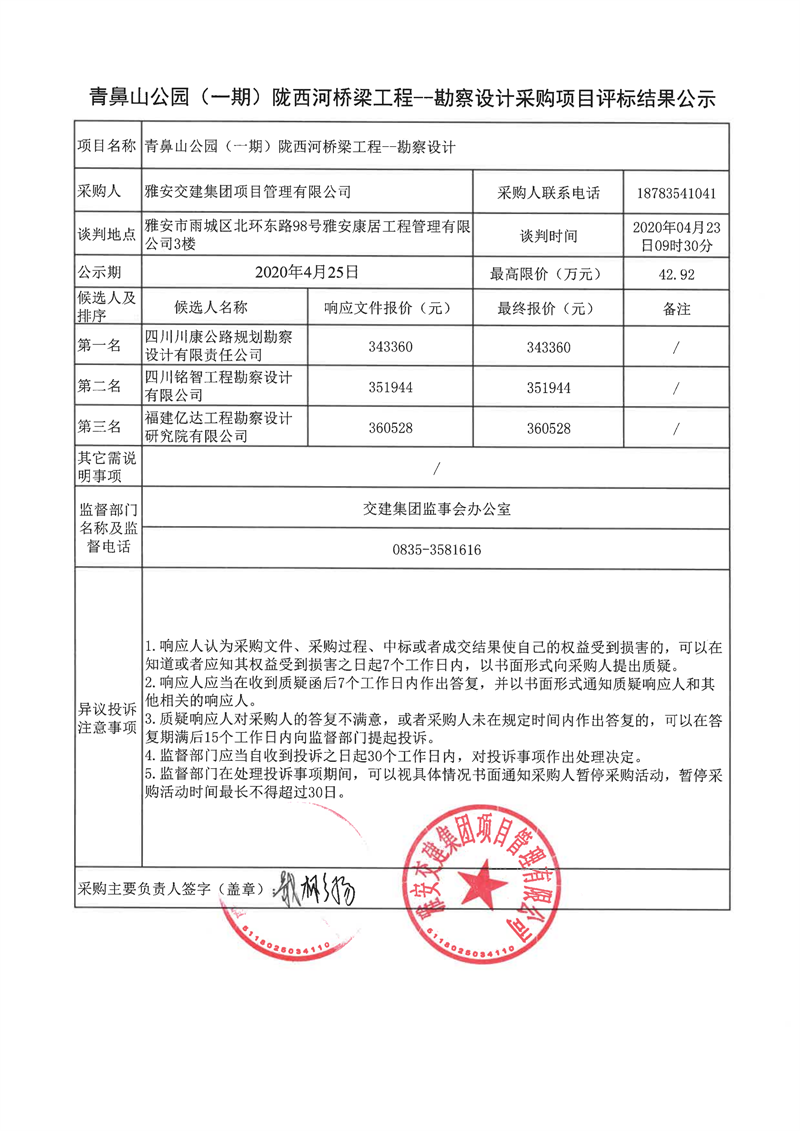 雅安交建集團(tuán)項目管理有限公司青鼻山公園(一期)隴西河橋梁工程項目勘察設(shè)計采購項目評標(biāo)結(jié)果公示