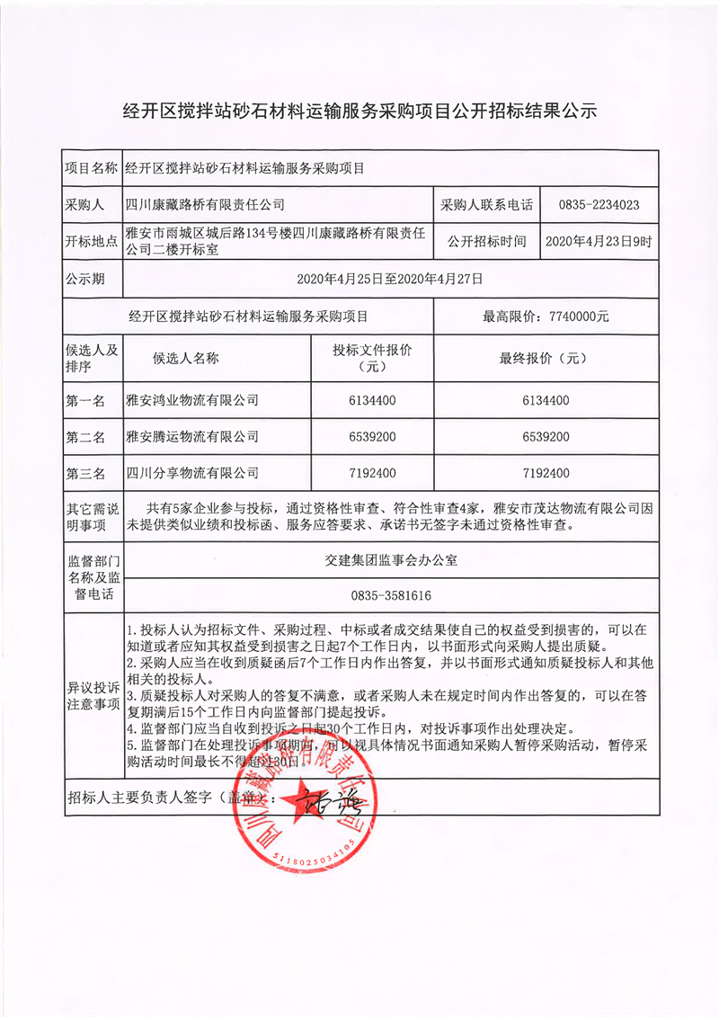 四川康藏路橋有限責(zé)任公司經(jīng)開區(qū)攪拌站砂石材料運輸服務(wù)采購項目公開招標結(jié)果公示