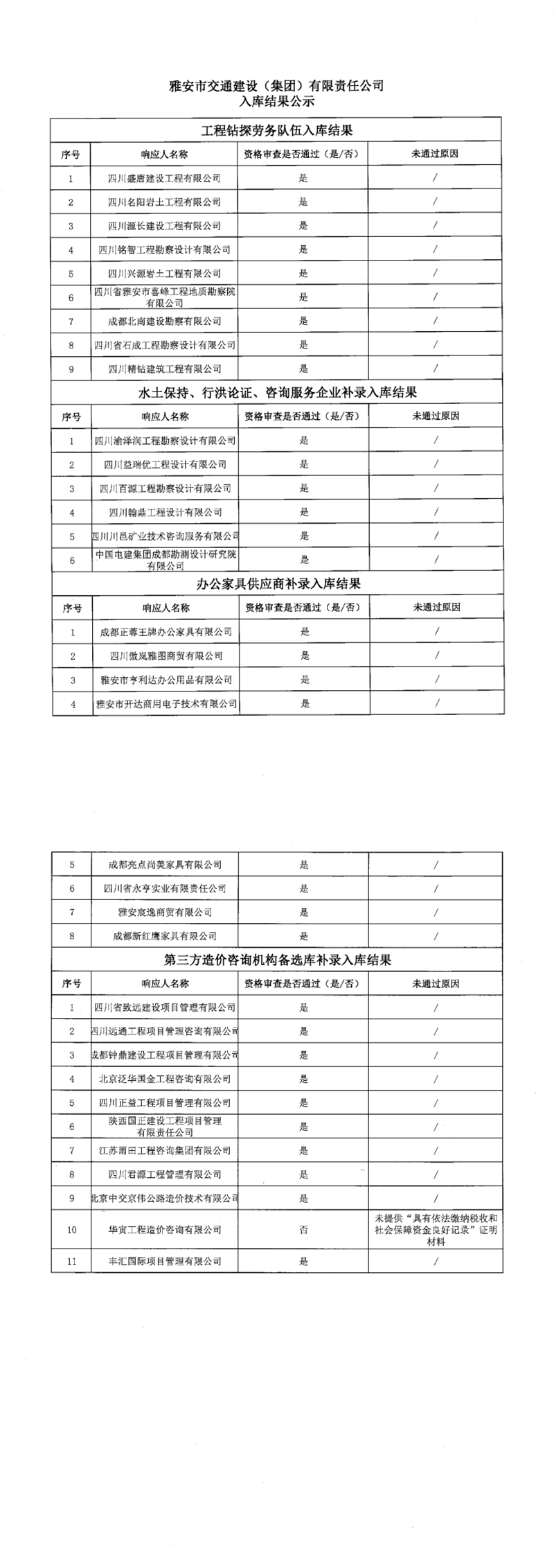 雅安市交通建設(集團)有限責任公司入庫結(jié)果公示
