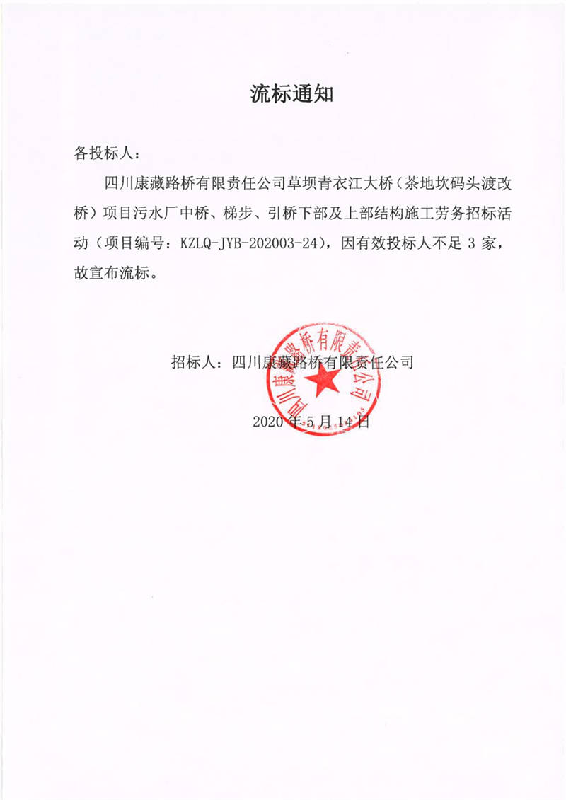四川康藏路橋有限責(zé)任公司草壩青衣江大橋(茶地坎碼頭渡改橋)項(xiàng)目污水廠中橋、梯步、引橋下部及上部結(jié)構(gòu)施工勞務(wù)流標(biāo)通知