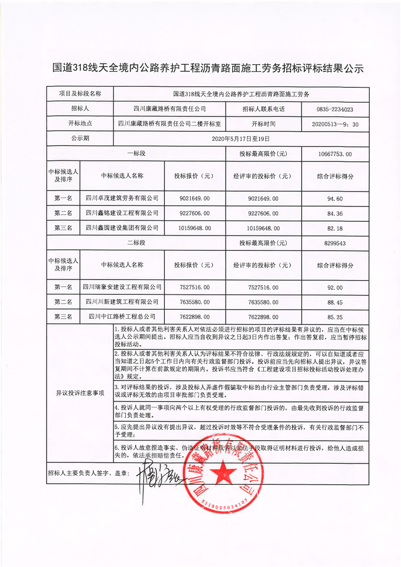 四川康藏路橋有限責(zé)任公司國道318線天全境內(nèi)公路養(yǎng)護(hù)工程瀝青路面施工勞務(wù)招標(biāo)評標(biāo)結(jié)果公示
