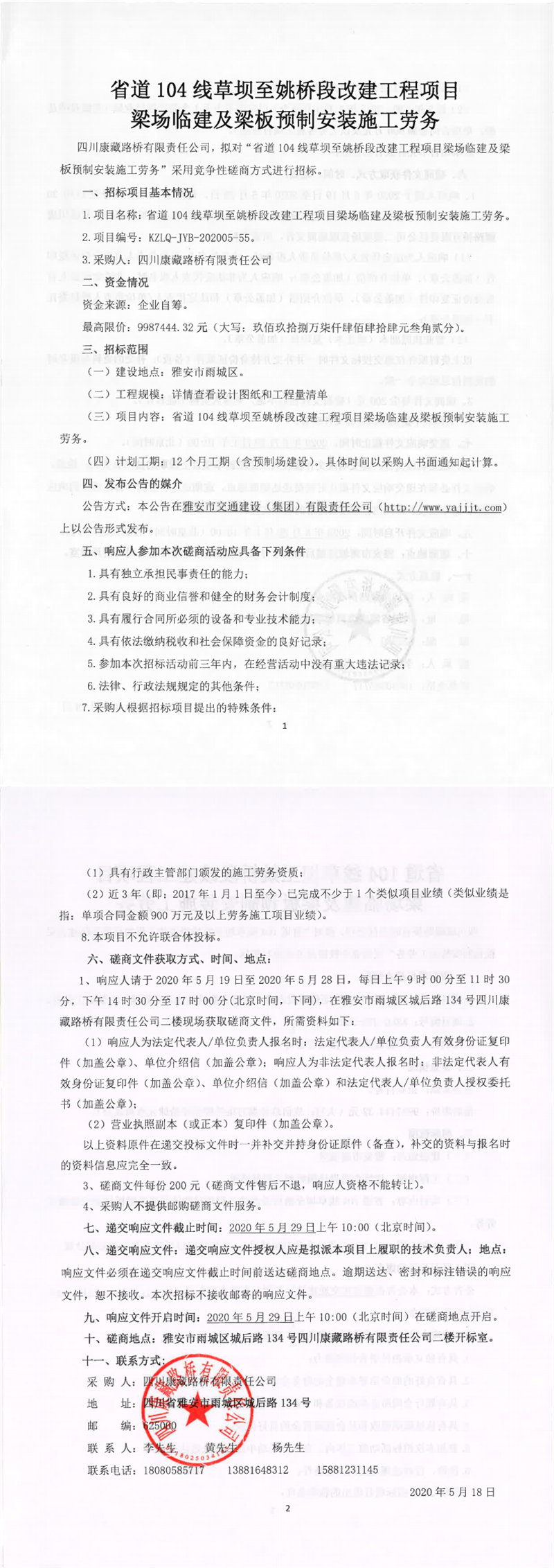 四川康藏路橋有限責(zé)任公司省道104線草壩至姚橋段改建工程項(xiàng)目梁場(chǎng)臨建及梁板預(yù)制安裝施工勞務(wù)競(jìng)爭(zhēng)性磋商公告