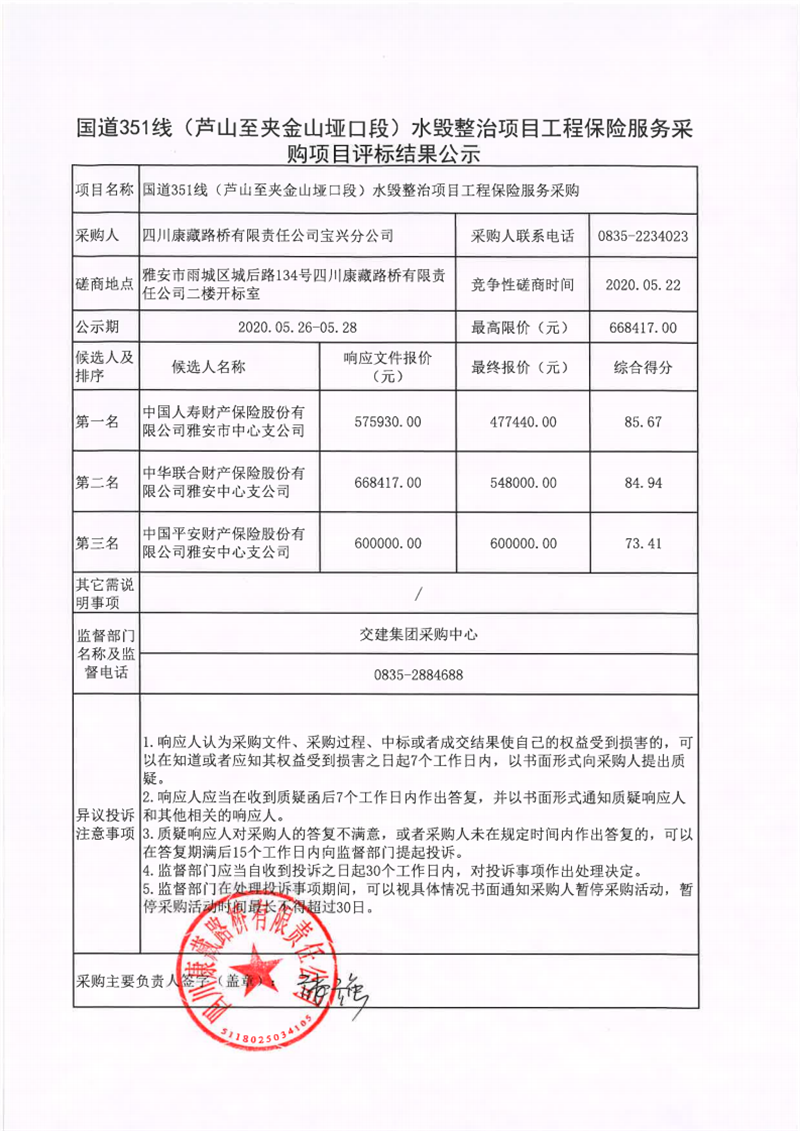 四川康藏路橋有限責任公司寶興分公司國道351線(蘆山至夾金山埡口段)水毀整治項目工程保險服務采購項目評標結(jié)果公示