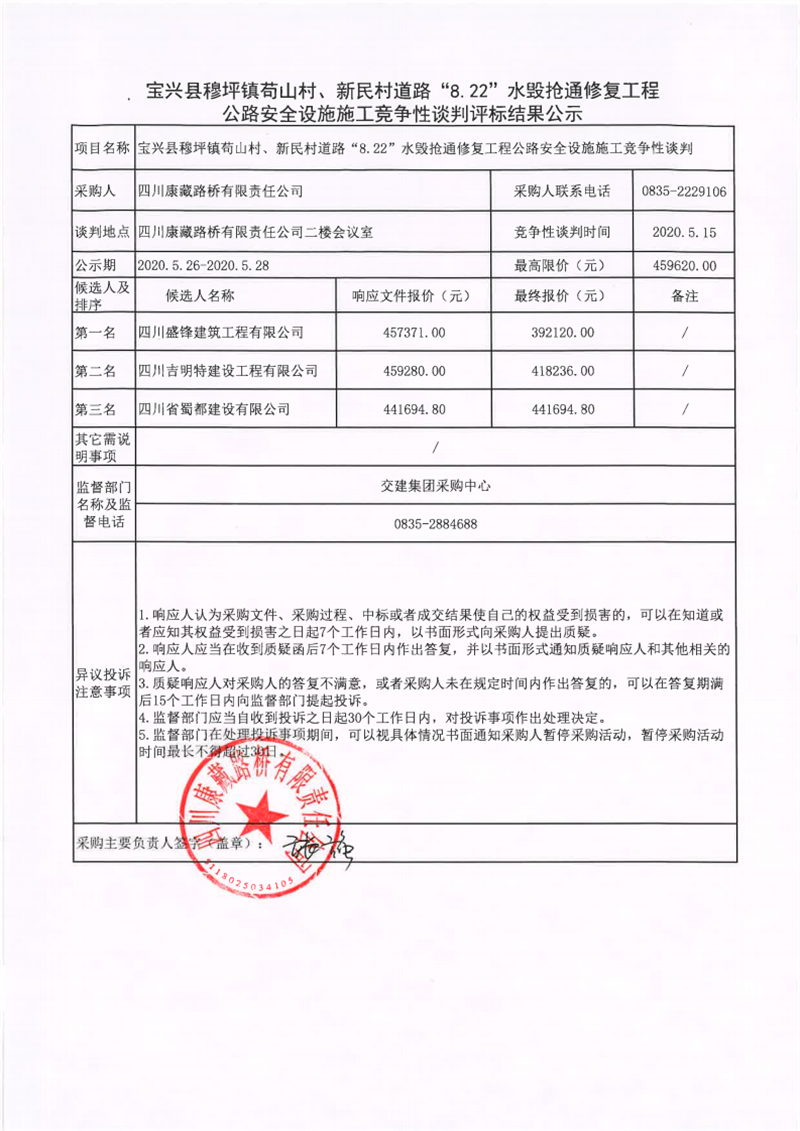 四川康藏路橋有限責(zé)任公司寶興縣穆坪鎮(zhèn)茍山村、新民村道路“8.22”水毀搶通修復(fù)工程公路安全設(shè)施施工競(jìng)爭(zhēng)性談判評(píng)標(biāo)結(jié)果公示