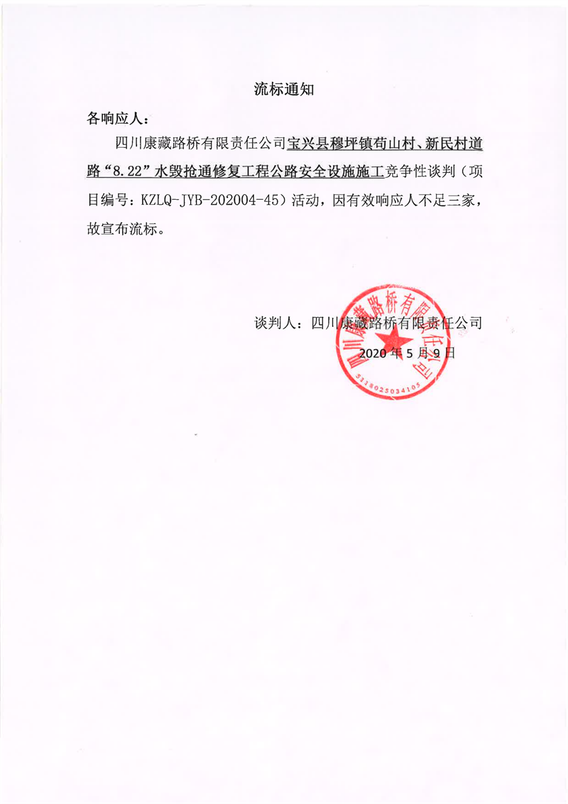 四川康藏路橋有限責(zé)任公司寶興縣穆坪鎮(zhèn)茍山村、新民村道路“8.22”水毀搶通修復(fù)工程公路安全設(shè)施施工競爭性談判流標通知