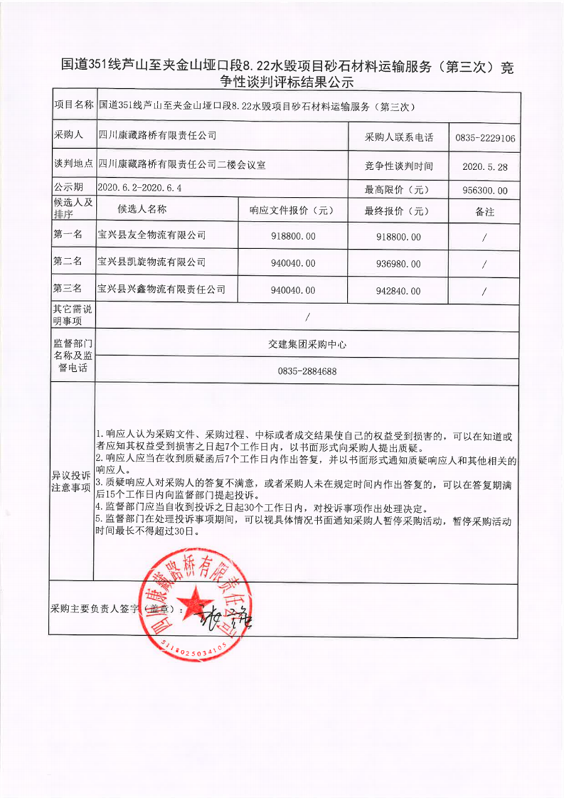 四川康藏路橋有限責(zé)任公司國(guó)道351線蘆山至夾金山埡口段8.22水毀項(xiàng)目砂石材料運(yùn)輸服務(wù)(第三次)競(jìng)爭(zhēng)性談判評(píng)標(biāo)結(jié)果公示