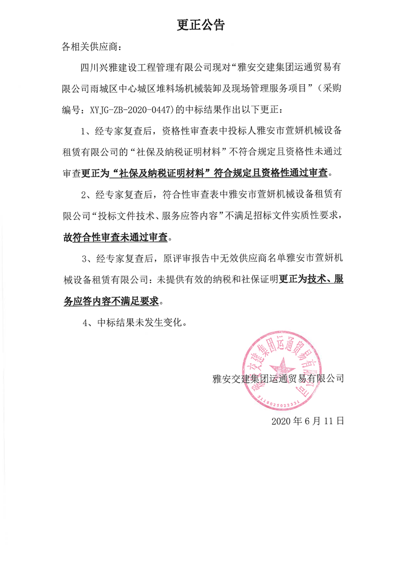 雅安交建集團運通貿(mào)易有限公司雨城區(qū)中心城區(qū)堆料場機械裝卸及現(xiàn)場管理服務項目更正公告