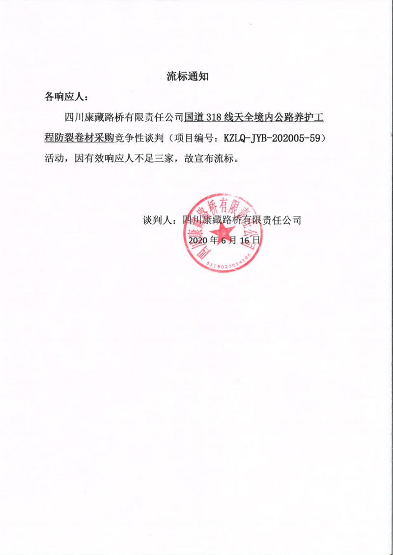 四川康藏路橋有限責(zé)任公司國道318線天全境內(nèi)公路養(yǎng)護工程防裂卷材采購流標(biāo)通知