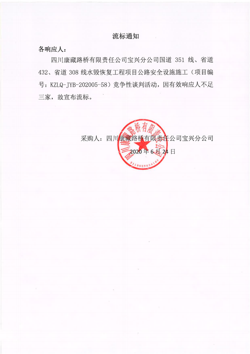 四川康藏路橋有限責(zé)任公司寶興分公司國道351線、省道432線、省道308線水毀修復(fù)工程項目公路安全設(shè)施施工流標(biāo)通知