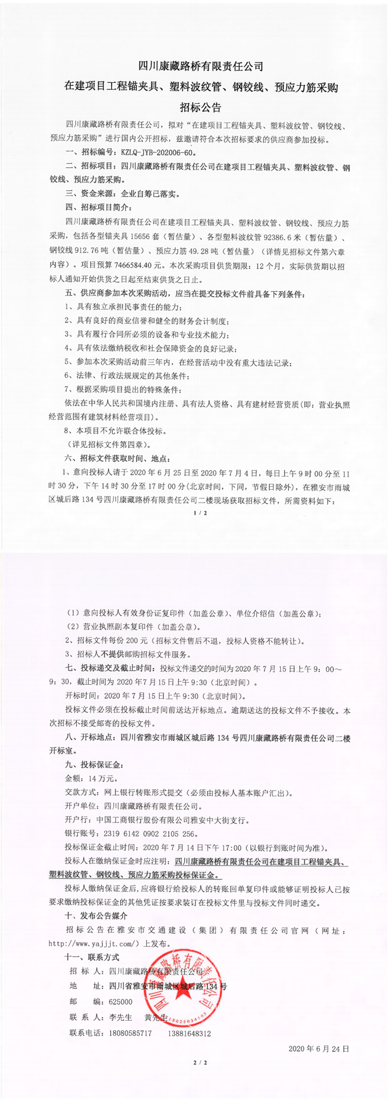四川康藏路橋有限責(zé)任公司在建項目工程錨夾具、塑料波紋管、鋼鉸線、預(yù)應(yīng)力筋采購招標(biāo)公告