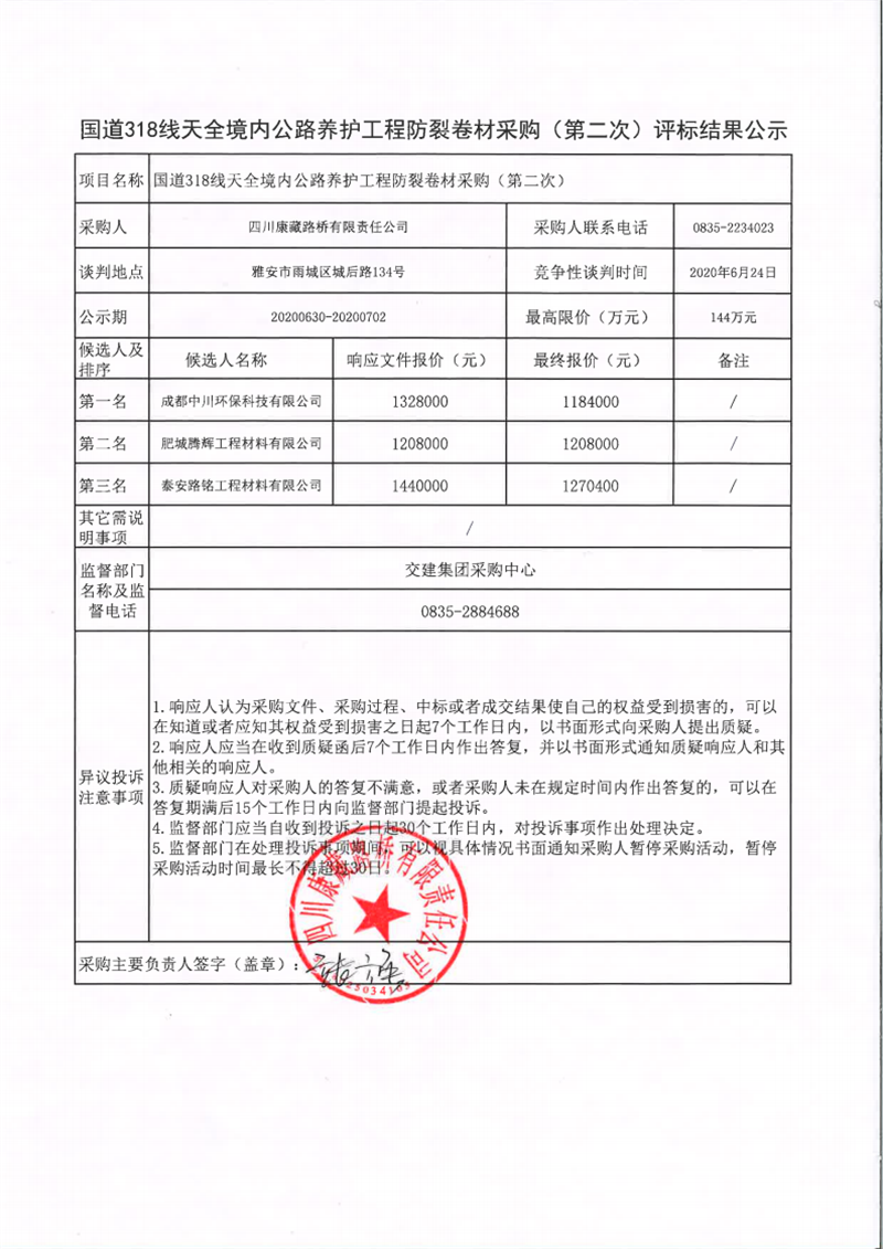 四川康藏路橋有限責任公司國道318線天全境內(nèi)公路養(yǎng)護工程防裂卷材采購(第二次)評標結(jié)果公示