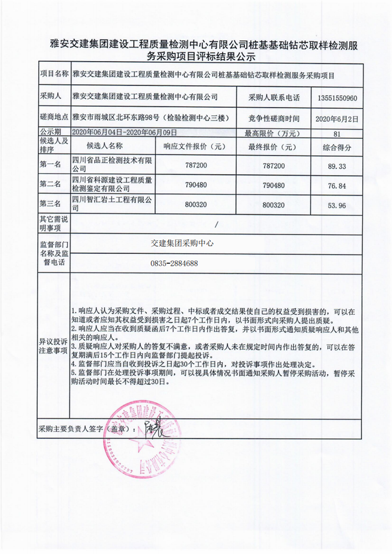雅安交建集團(tuán)建設(shè)工程質(zhì)量檢測(cè)中心有限公司樁基基礎(chǔ)鉆芯取樣檢測(cè)服務(wù)采購項(xiàng)目評(píng)標(biāo)結(jié)果公示