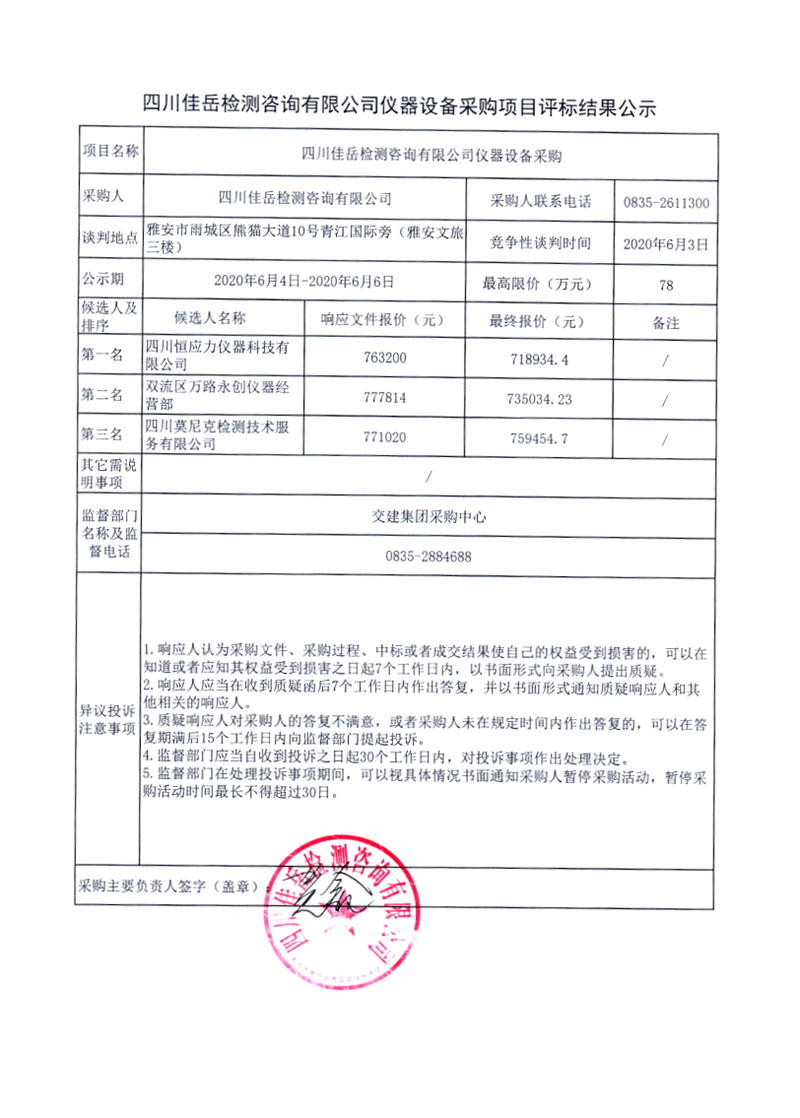 四川佳岳檢測咨詢有限公司儀器設備采購項目評標結果公示
