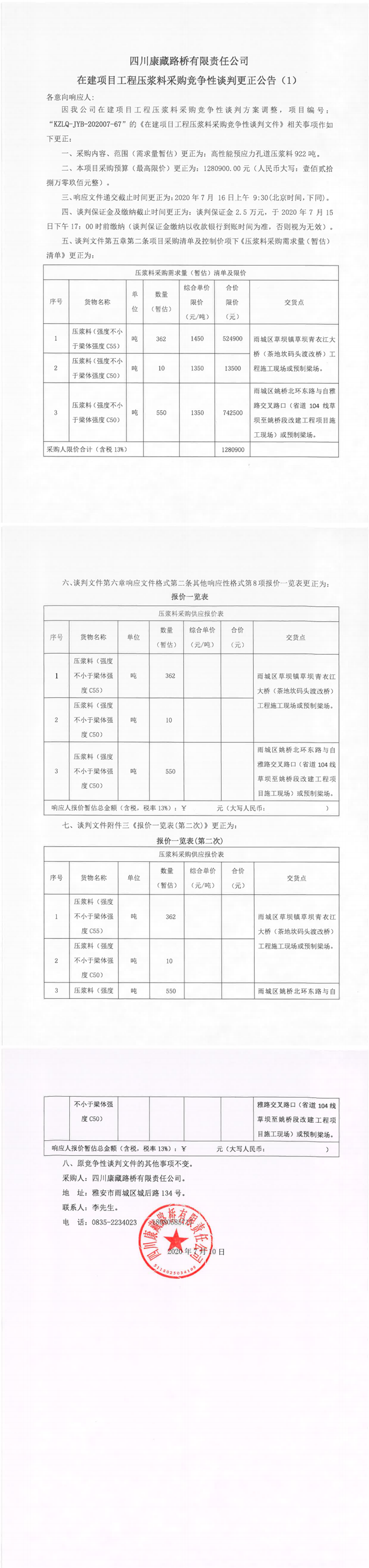 四川康藏路橋有限責任公司在建項目工程壓漿料采購競爭性談判更正公告(1)