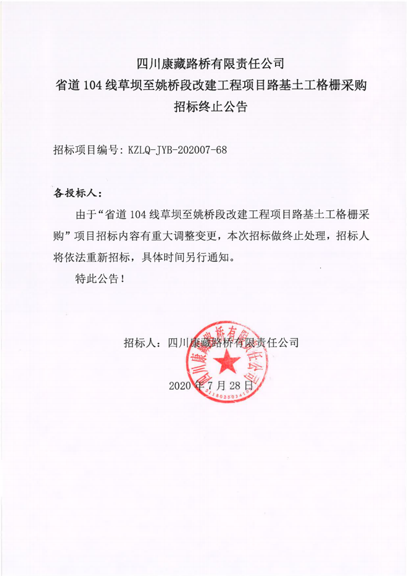 四川康藏路橋有限公司省道104線草壩至姚橋段改建工程項目路基土工格柵采購招標終止公告