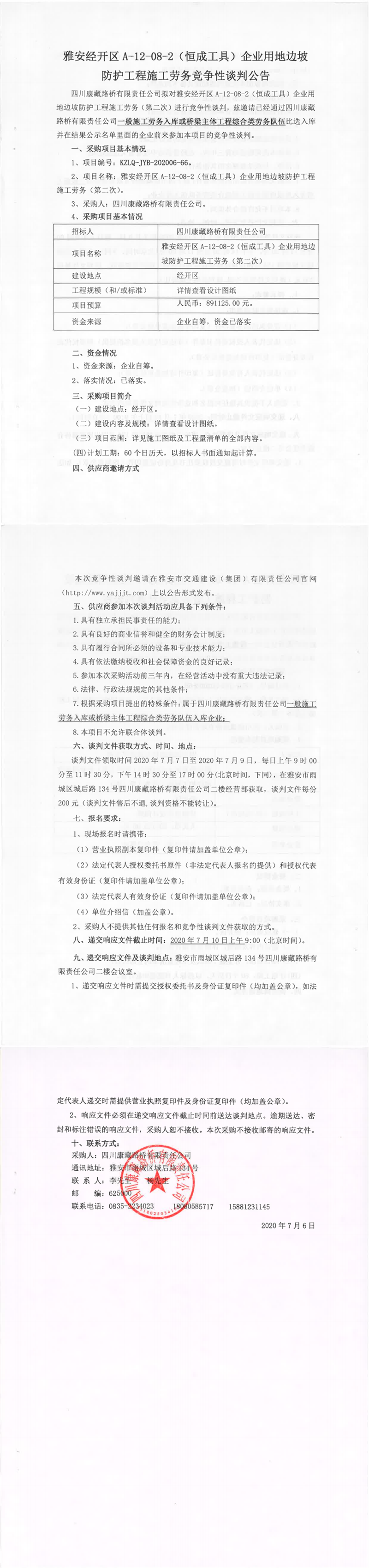 四川康藏路橋有限責任公司雅安經(jīng)開區(qū)A-12-08-2(恒成工具)企業(yè)用地邊坡防護工程施工勞務(第二次)競爭性談判公告