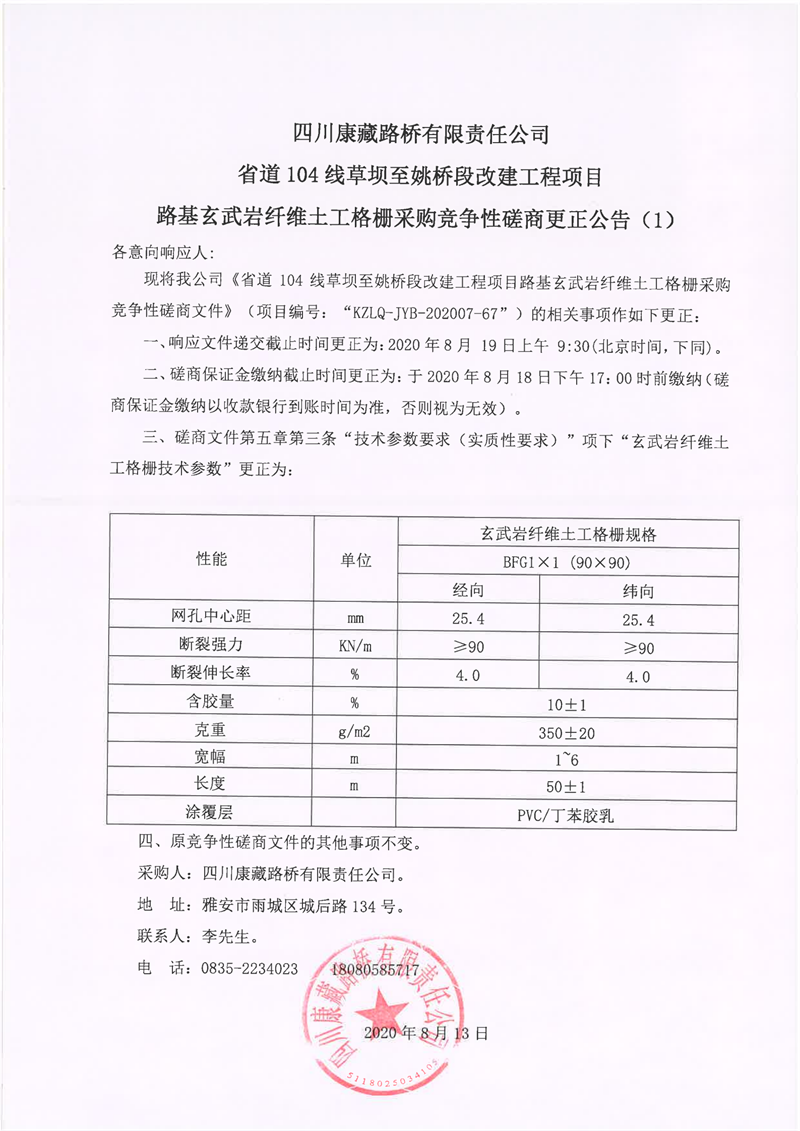 四川康藏路橋有限責(zé)任公司省道104線草壩至姚橋段改建工程項(xiàng)目路基玄武巖纖維土工格柵采購競(jìng)爭(zhēng)性磋商更正公告(1)