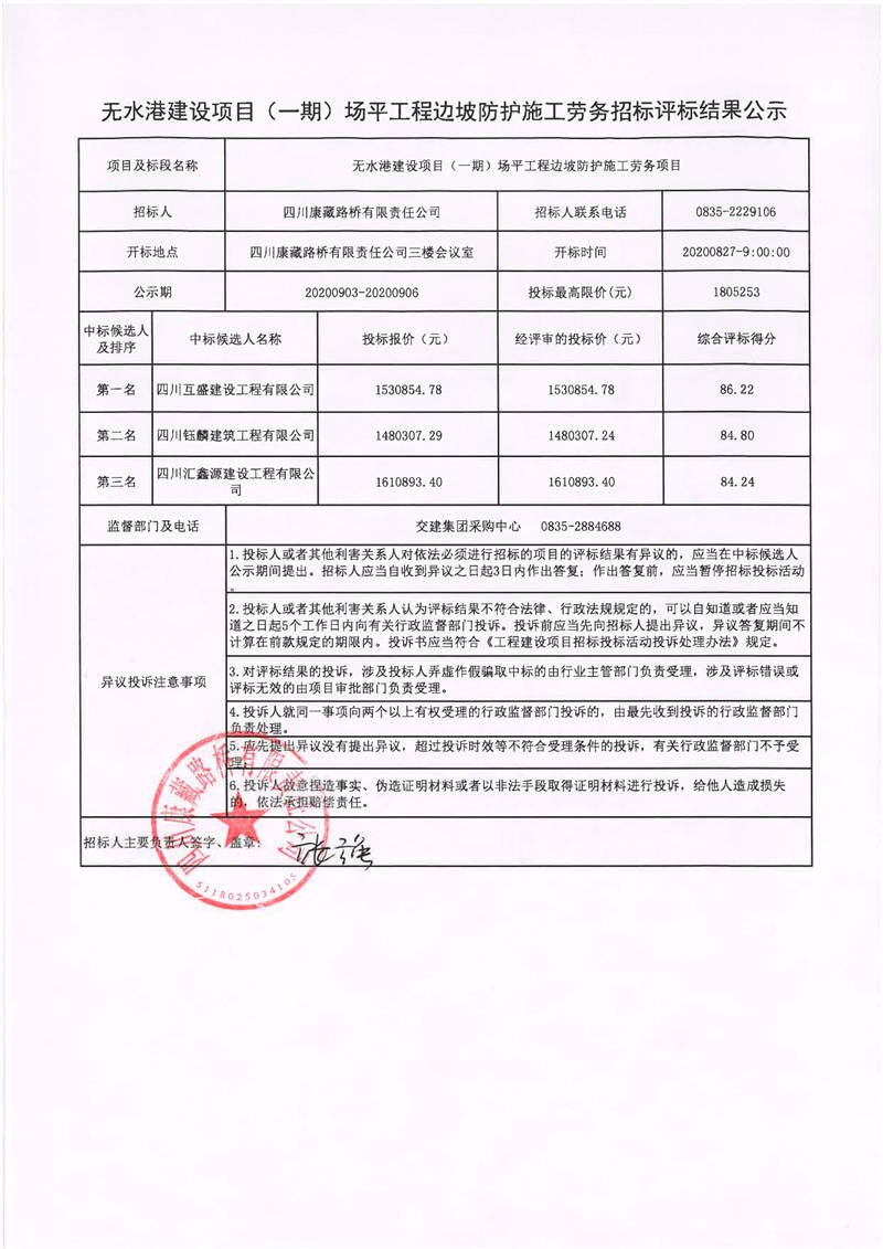 四川康藏路橋有限責(zé)任公司無水港建設(shè)項(xiàng)目(一期)場平工程邊坡防護(hù)施工勞務(wù)招標(biāo)評(píng)標(biāo)結(jié)果公示