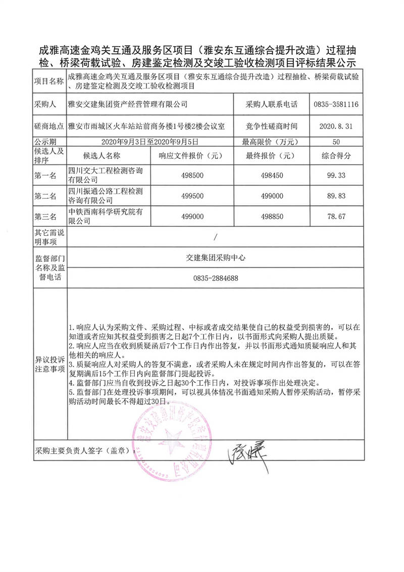 雅安交建集團(tuán)資產(chǎn)經(jīng)營管理有限公司成雅高速金雞關(guān)互通及服務(wù)區(qū)項(xiàng)目(雅安東互通綜合提升改造)過程抽檢、橋梁荷載試驗(yàn)、房建鑒定檢測(cè)及交竣工驗(yàn)收檢測(cè)項(xiàng)目評(píng)標(biāo)結(jié)果公示