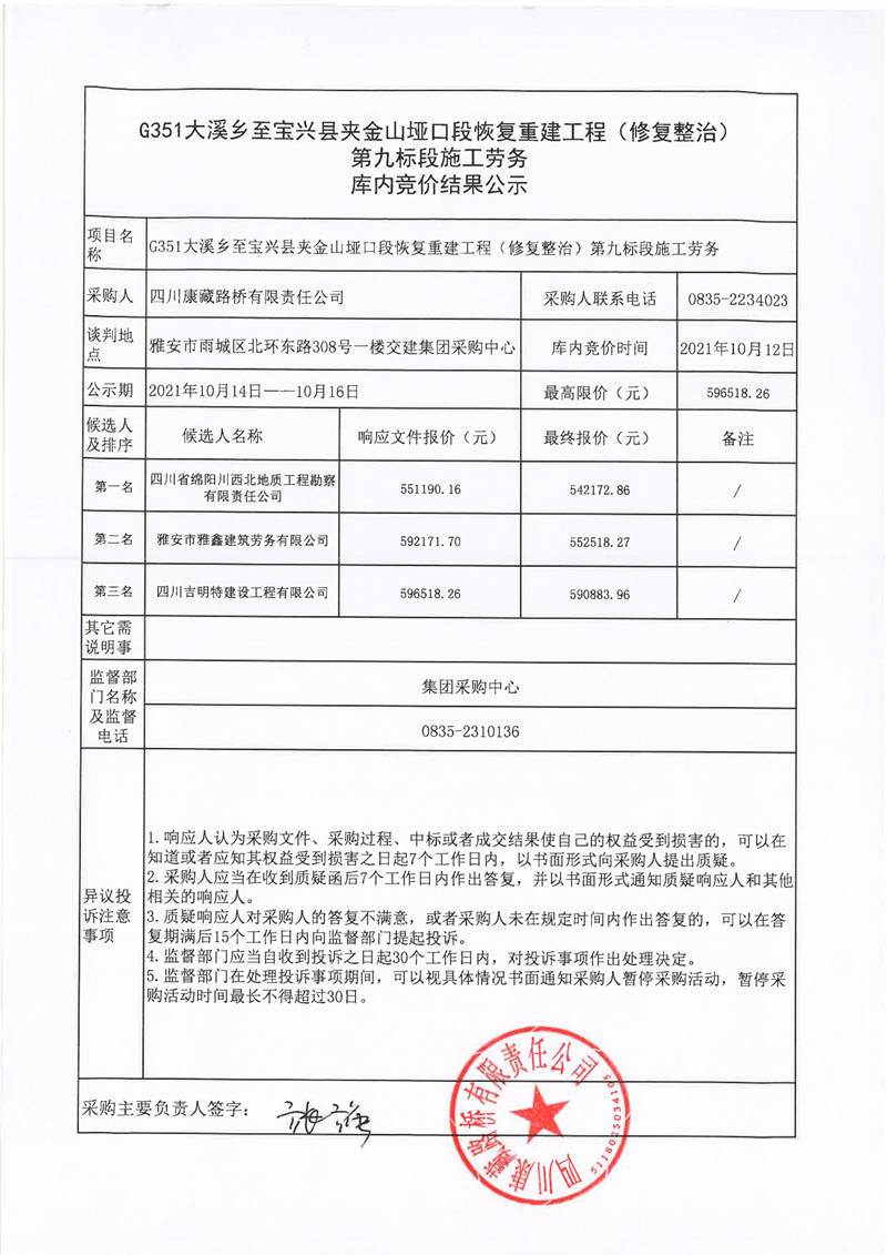 四川康藏路橋有限責任公司G351大溪鄉(xiāng)至寶興縣夾金山埡口段恢復重建工程(修復整治)第九標段施工勞務庫內(nèi)競價結(jié)果公示