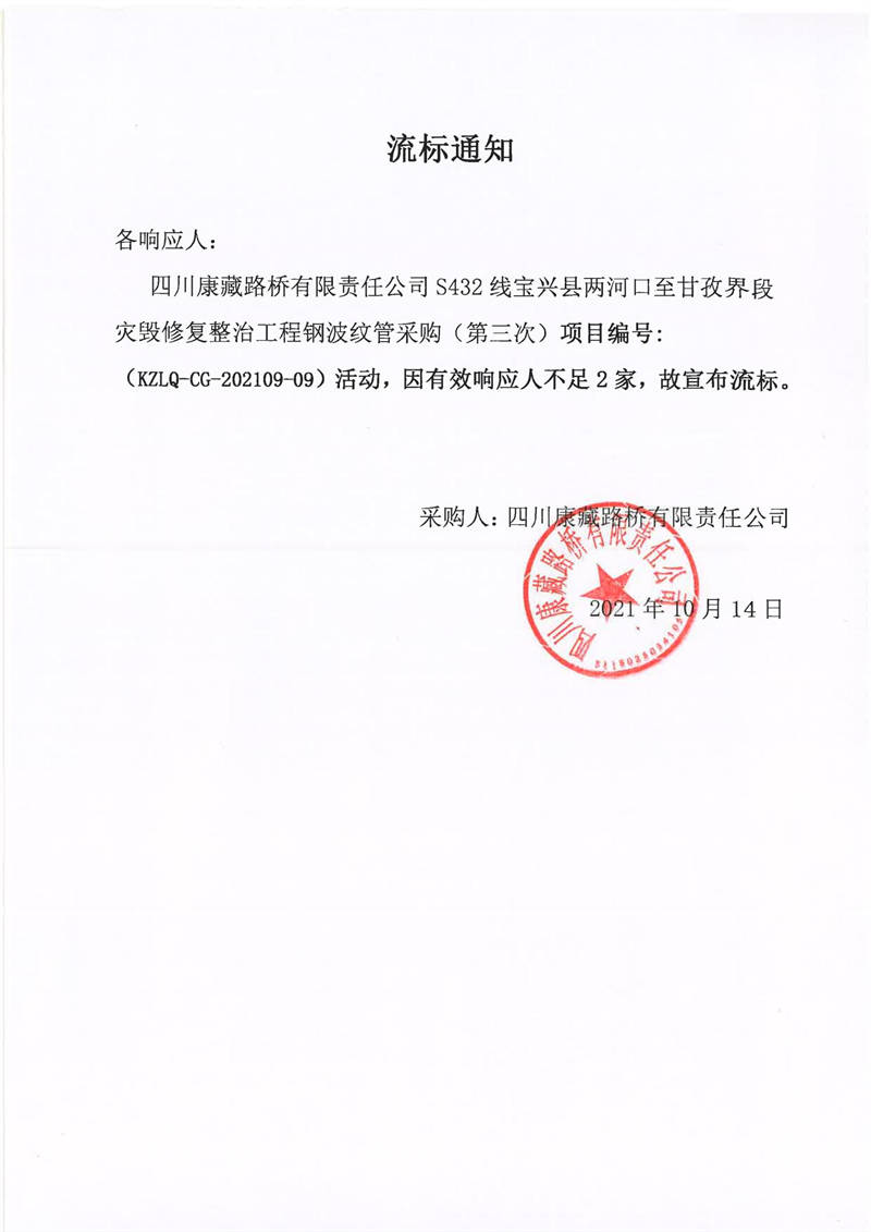 四川康藏路橋有限責任公司S432線寶興縣兩河口至甘孜界段災毀修復整治工程鋼波紋管采購(第三次)競價公告
