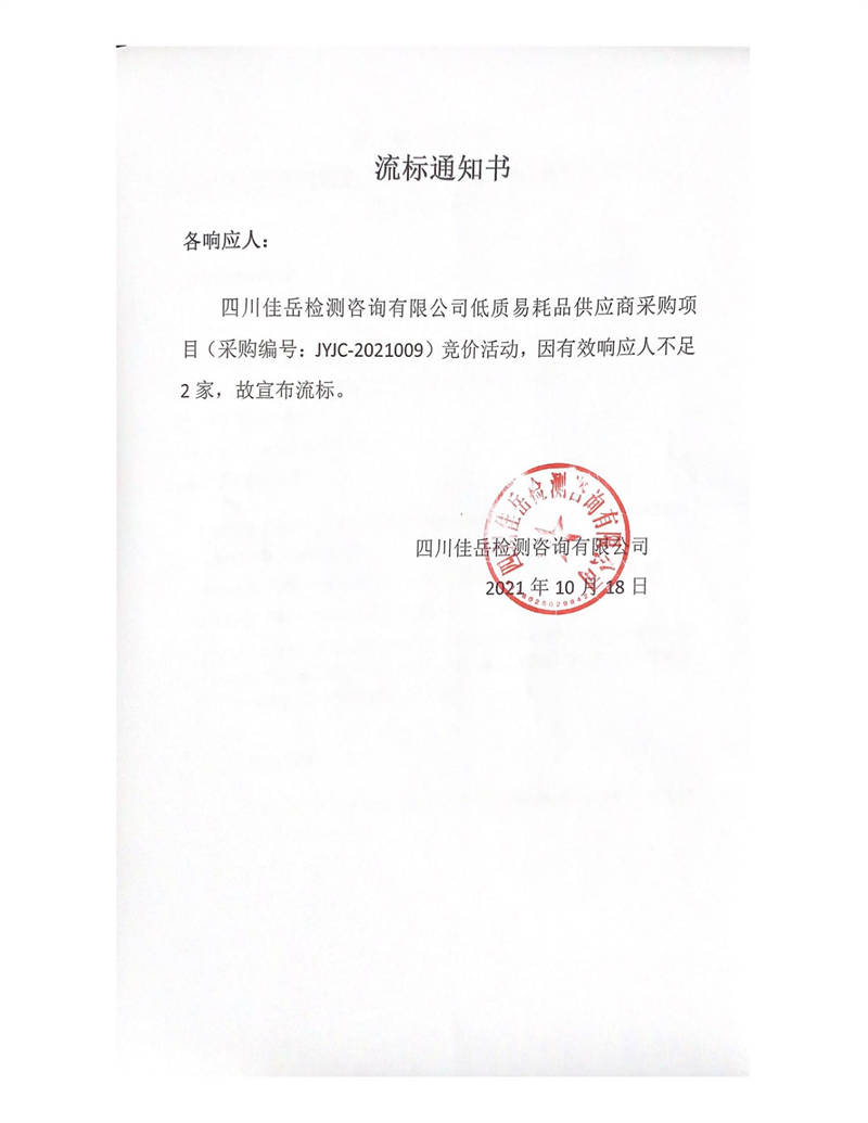 四川佳岳檢測(cè)咨詢有限公司低質(zhì)易耗品供應(yīng)商采購(gòu)項(xiàng)目流標(biāo)通知