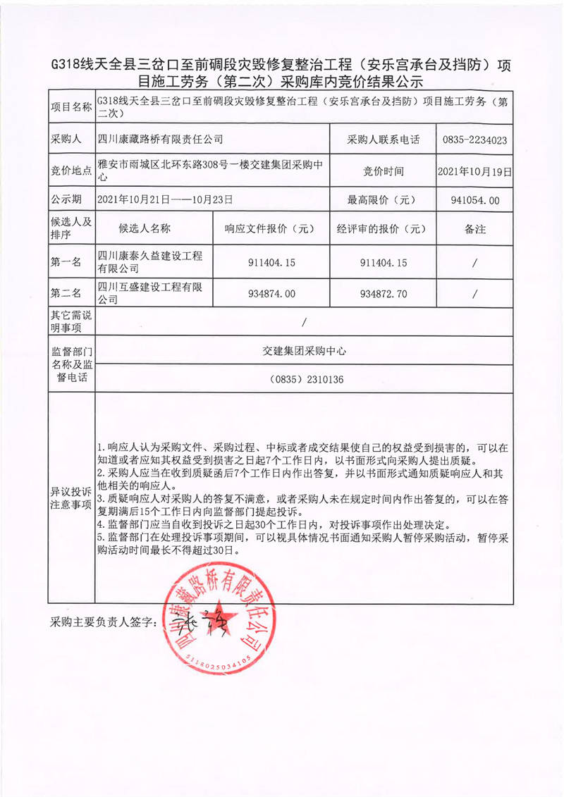 四川康藏路橋有限責(zé)任公司G318線天全縣三岔口至前碉段災(zāi)毀修復(fù)整治工程(安樂宮承臺及擋防)項目施工勞務(wù)(第二次)采購庫內(nèi)競價結(jié)果公示