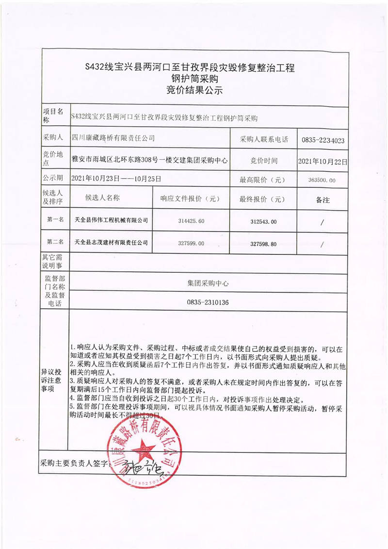 四川康藏路橋有限責(zé)任公司S432線(xiàn)寶興縣兩河口至甘孜界段災(zāi)毀修復(fù)整治工程鋼護(hù)筒采購(gòu)競(jìng)價(jià)結(jié)果公示