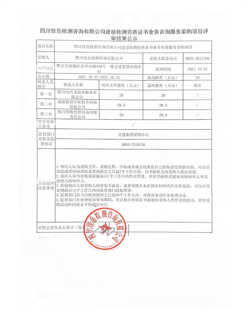 四川佳岳檢測(cè)咨詢有限公司建設(shè)檢測(cè)資質(zhì)證書(shū)業(yè)務(wù)咨詢服務(wù)采購(gòu)項(xiàng)目評(píng)審結(jié)果公示