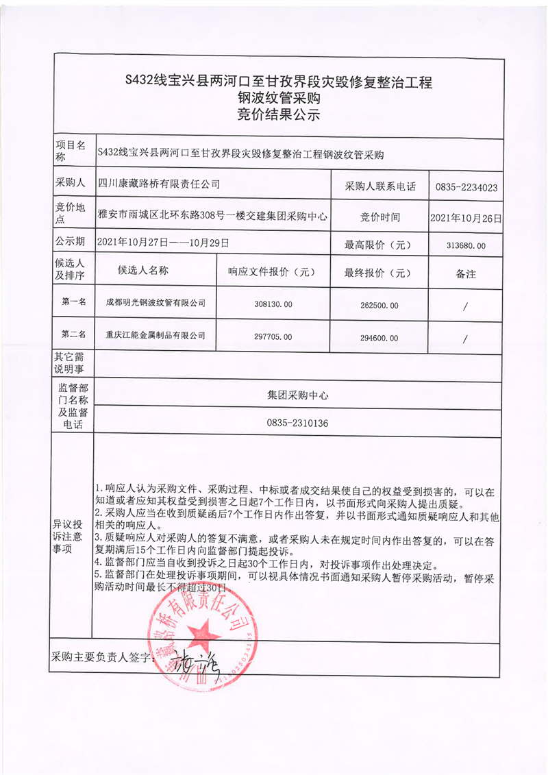 四川康藏路橋有限責(zé)任公司S432線(xiàn)寶興縣兩河口至甘孜界段災(zāi)毀修復(fù)整治工程鋼波紋管采購(gòu)競(jìng)價(jià)結(jié)果公示