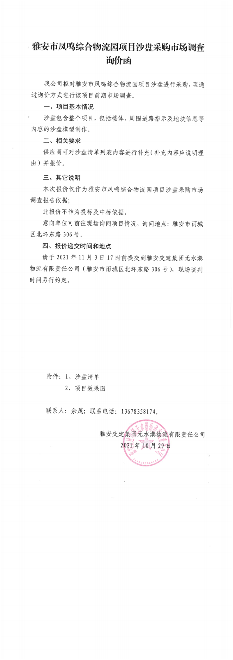 雅安交建集團無水港物流有限責任公司雅安市鳳鳴綜合物流園項目沙盤采購市場調(diào)查詢價函
