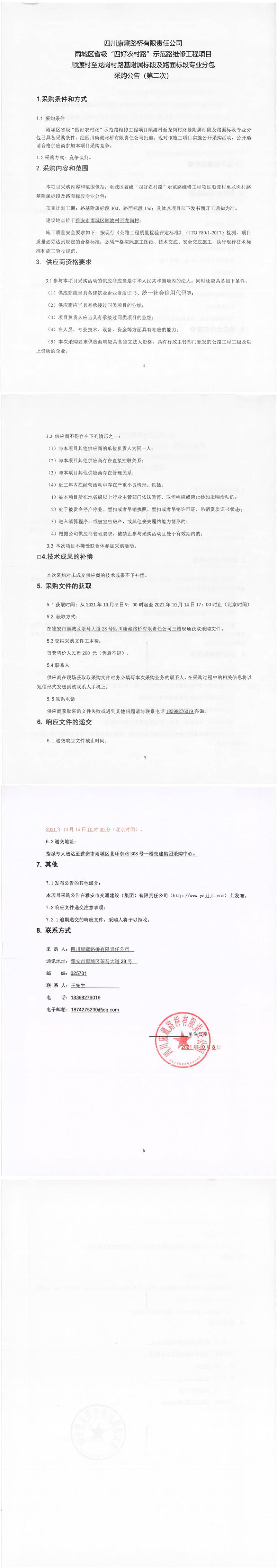 四川康藏路橋有限責任公司雨城區(qū)省級“四好農(nóng)村路”示范路維修工程項目順渡村至龍崗村路基附屬標段及路面標段專業(yè)分包采購公告(第二次)