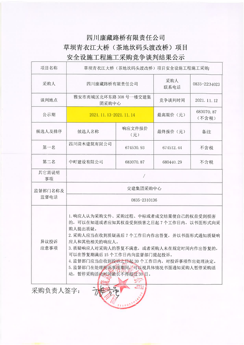 四川康藏路橋有限責任公司草壩青衣江大橋(茶地坎碼頭渡改橋)項目安全設施施工采購競爭談判結(jié)果公示