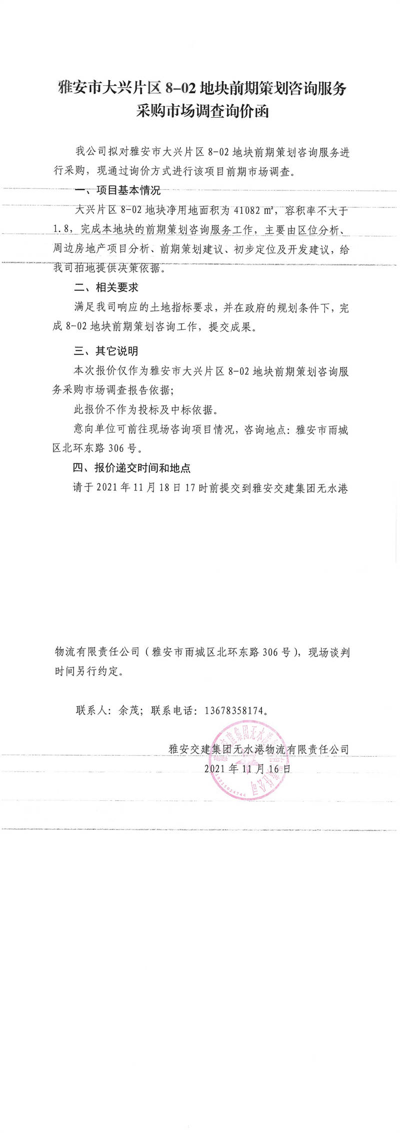 雅安交建集團無水港物流有限責任公司雅安市大興片區(qū)8-02地塊前期策劃咨詢服務采購市場調查詢價函