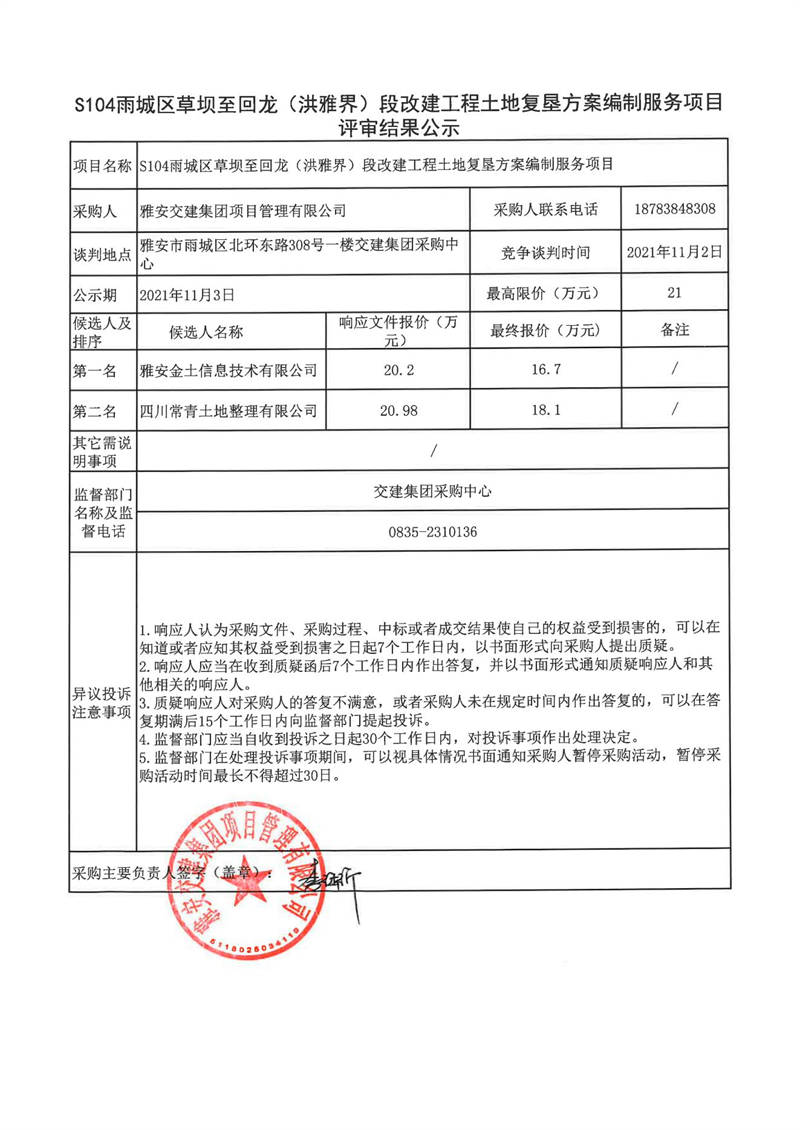雅安交建集團(tuán)項目管理有限公司S104雨城區(qū)草壩至回龍(洪雅界)段改建工程土地復(fù)墾方案編制服務(wù)項目評審結(jié)果公示