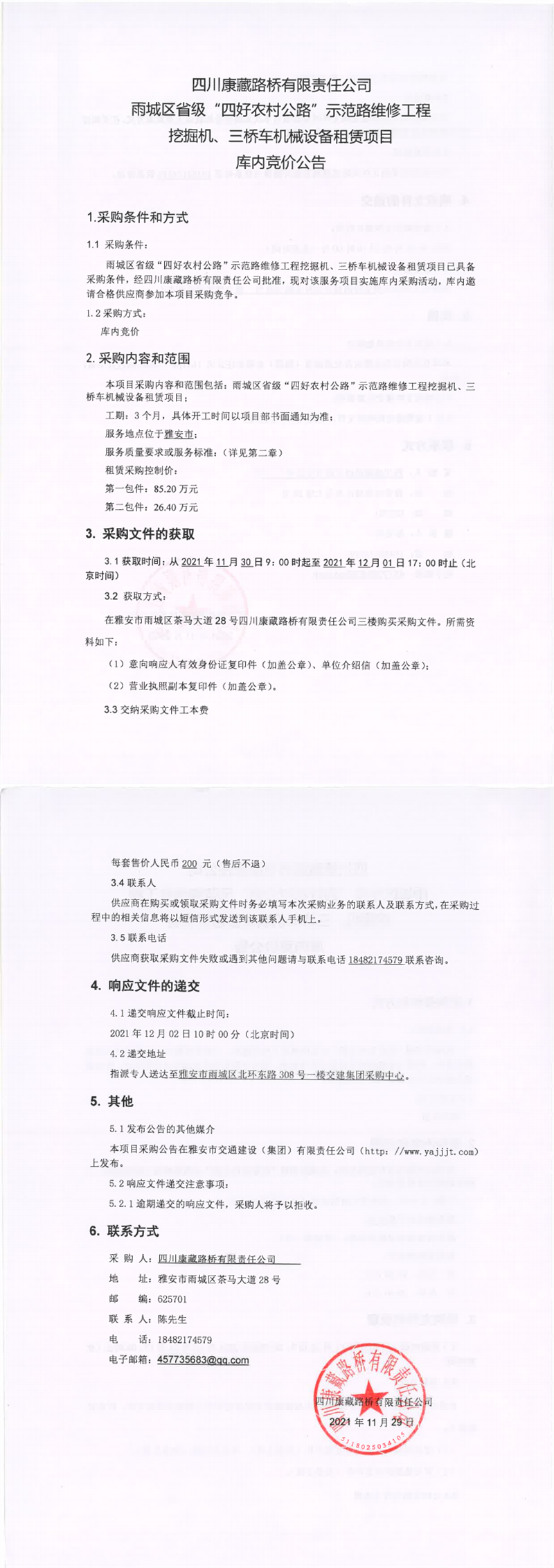 四川康藏路橋有限責(zé)任公司雨城區(qū)省級(jí)“四好農(nóng)村公路”示范路維修工程挖掘機(jī)、三橋車(chē)機(jī)械設(shè)備租賃項(xiàng)目庫(kù)內(nèi)競(jìng)價(jià)公告