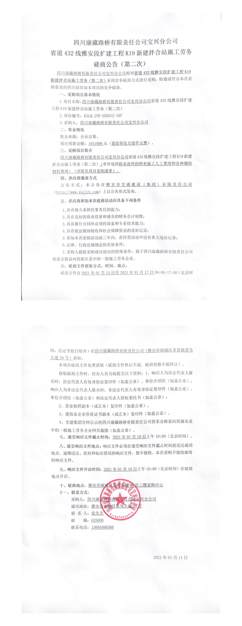 四川康藏路橋有限責任公司寶興分公司省道432線雅安段擴建工程K19新建拌合站施工勞務(wù)磋商公告(第二次)