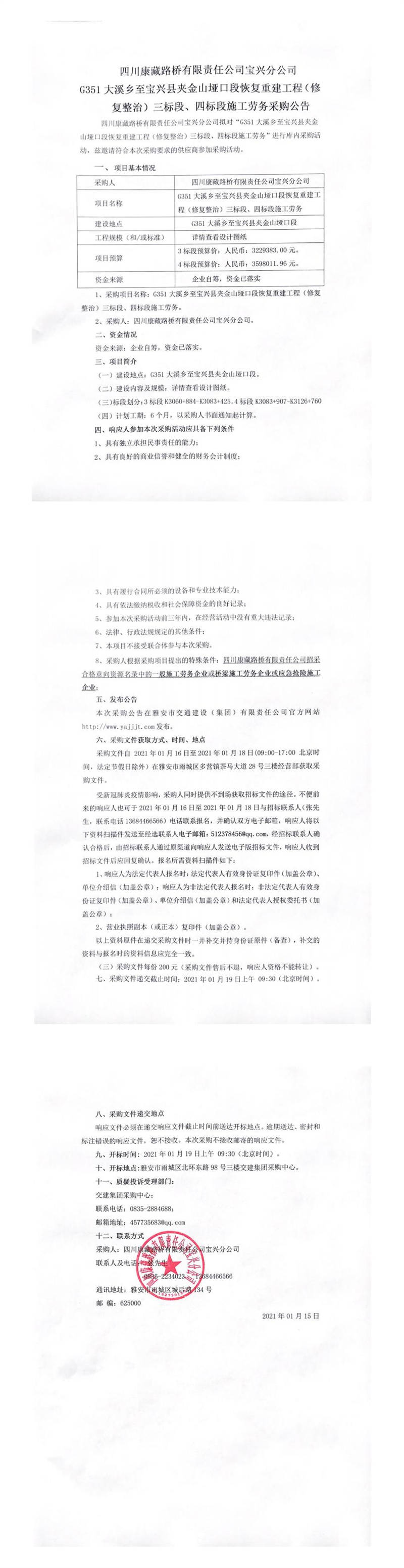 四川康藏路橋有限責任公司寶興分公司G351線寶興縣大溪鄉(xiāng)至寶興縣夾金山埡口段恢復(fù)重建工程(修復(fù)整治)三標段、四標段施工勞務(wù)采購公告