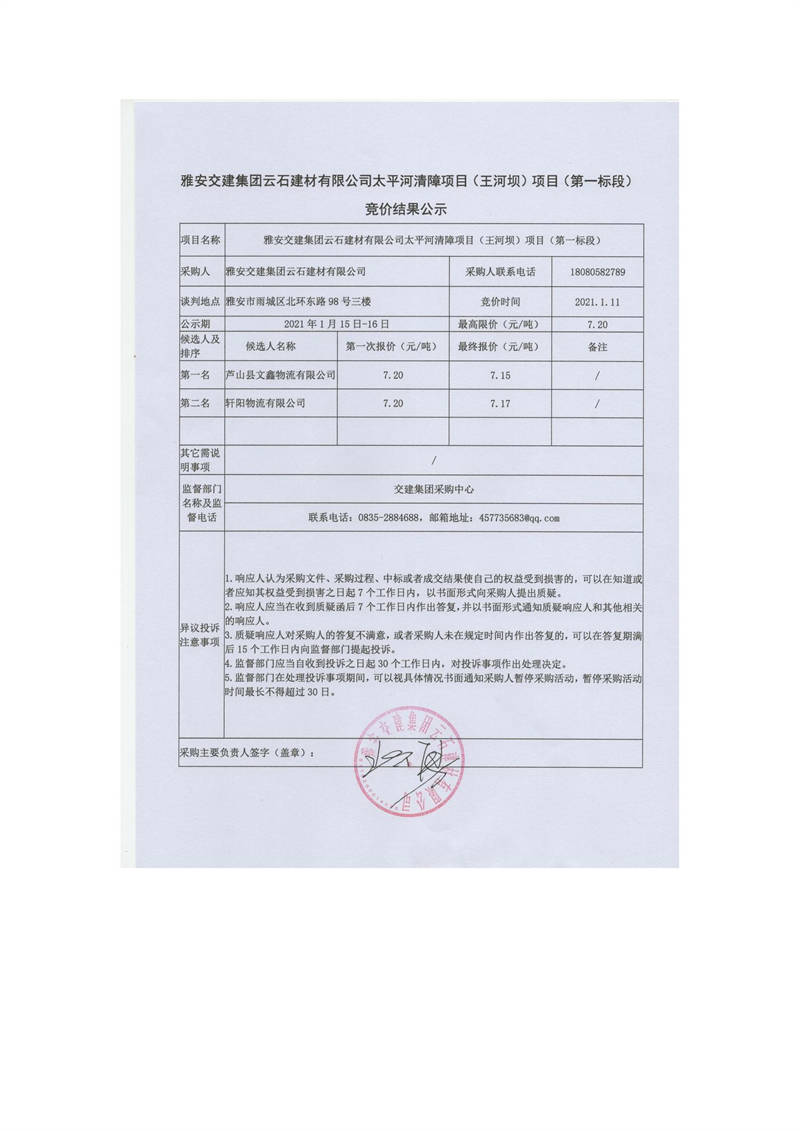 雅安交建集團(tuán)云石建材有限公司太平河清障項(xiàng)目(王河壩)項(xiàng)目(第一標(biāo)段)競價(jià)結(jié)果公示