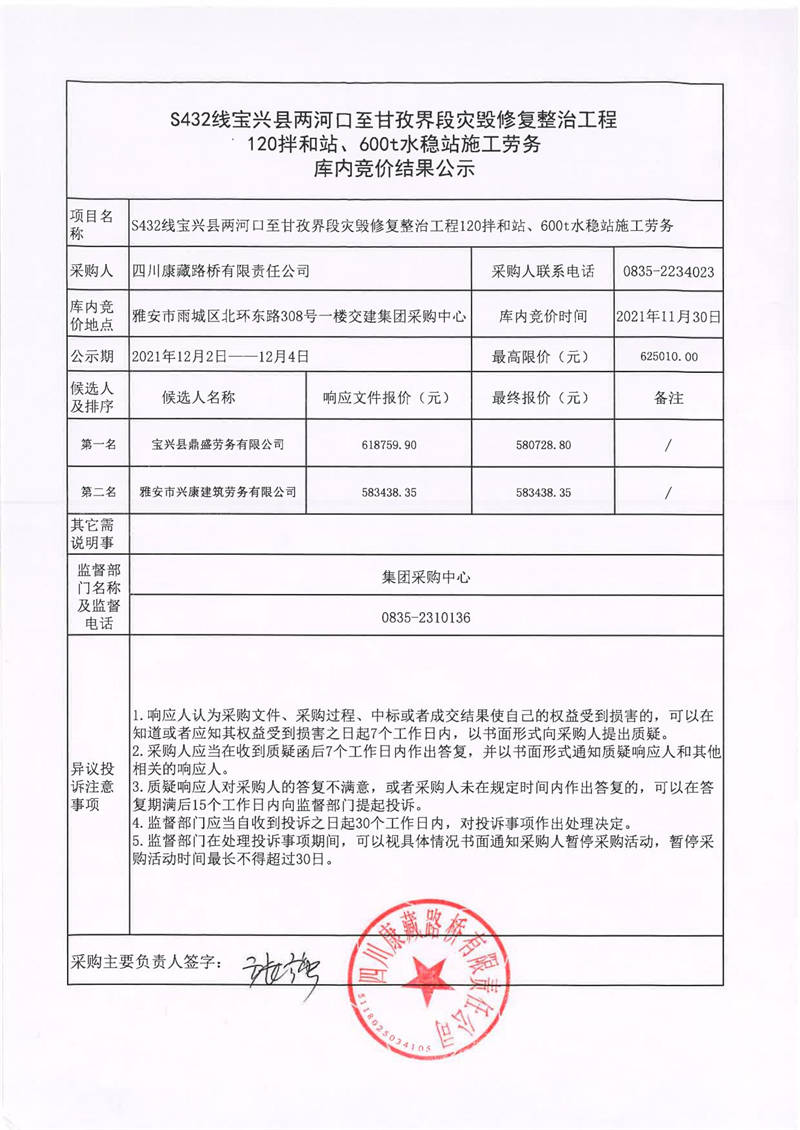 四川康藏路橋有限責任公司S432線寶興縣兩河口至甘孜界段災(zāi)毀修復(fù)整治工程120拌和站、600t水穩(wěn)站施工勞務(wù)庫內(nèi)競價結(jié)果公示