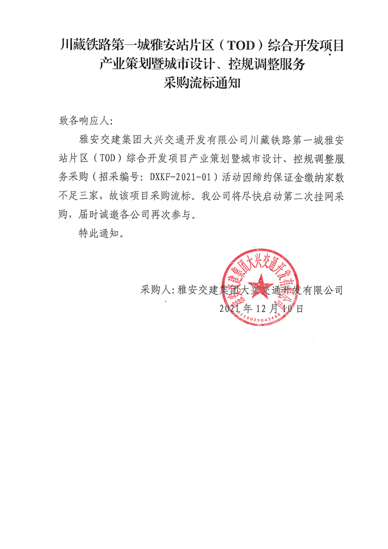 雅安交建集團大興交通開發(fā)有限公司川藏鐵路第一城雅安站片區(qū)(TOD)綜合開發(fā)項目產(chǎn)業(yè)策劃暨城市設計、控規(guī)調整服務采購流標通知