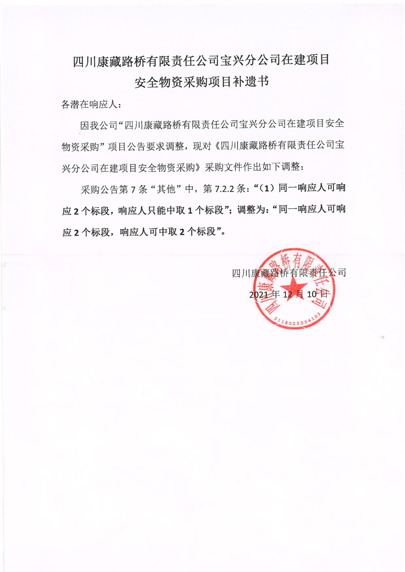 四川康藏路橋有限責(zé)任公司寶興分公司在建項(xiàng)目安全物資采購(gòu)項(xiàng)目補(bǔ)遺書