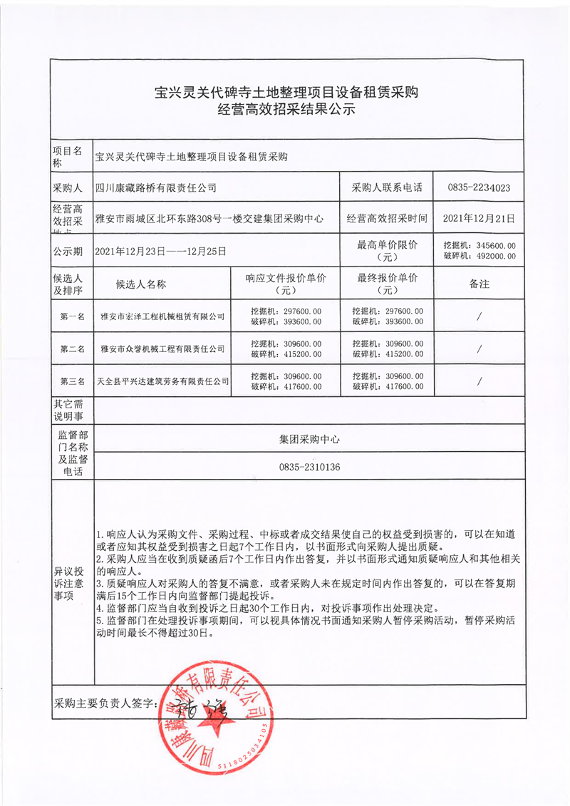 四川康藏路橋有限責(zé)任公司寶興靈關(guān)代碑寺土地整理項(xiàng)目設(shè)備租賃采購經(jīng)營高效招采結(jié)果公示