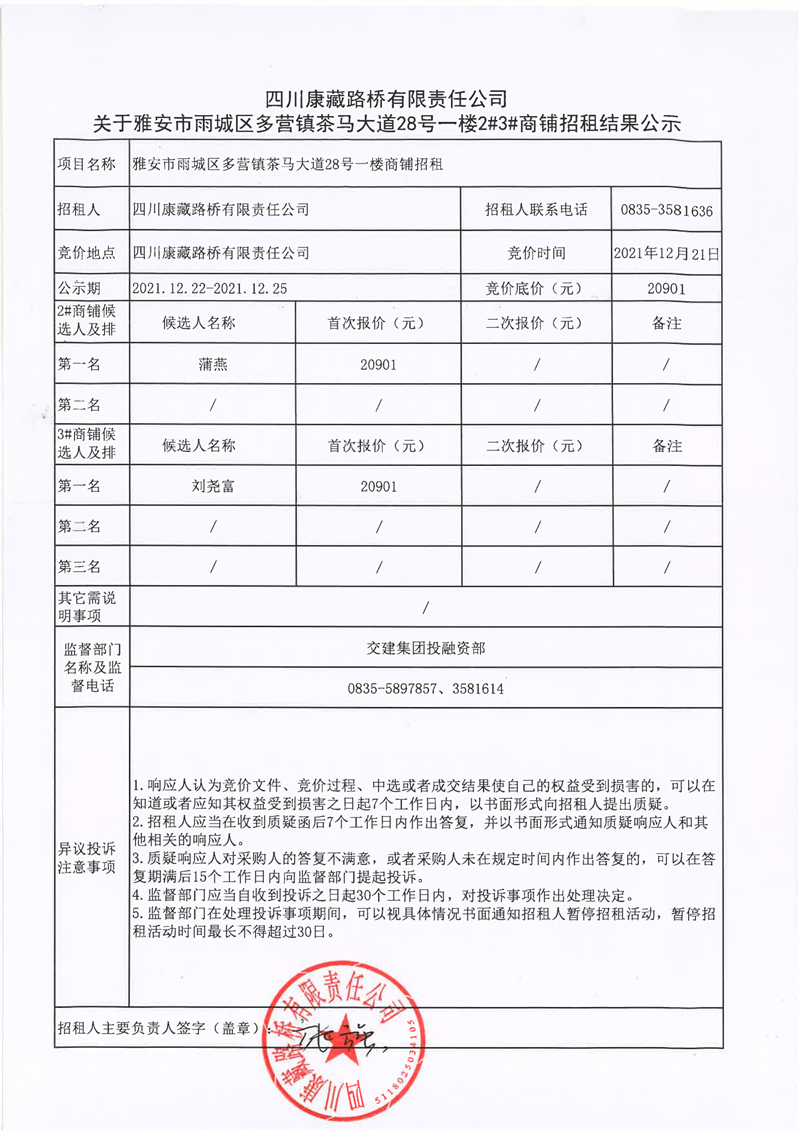 四川康藏路橋有限責(zé)任公司關(guān)于雅安市雨城區(qū)多營鎮(zhèn)茶馬大道28號一樓2#3#商鋪招租結(jié)果公示